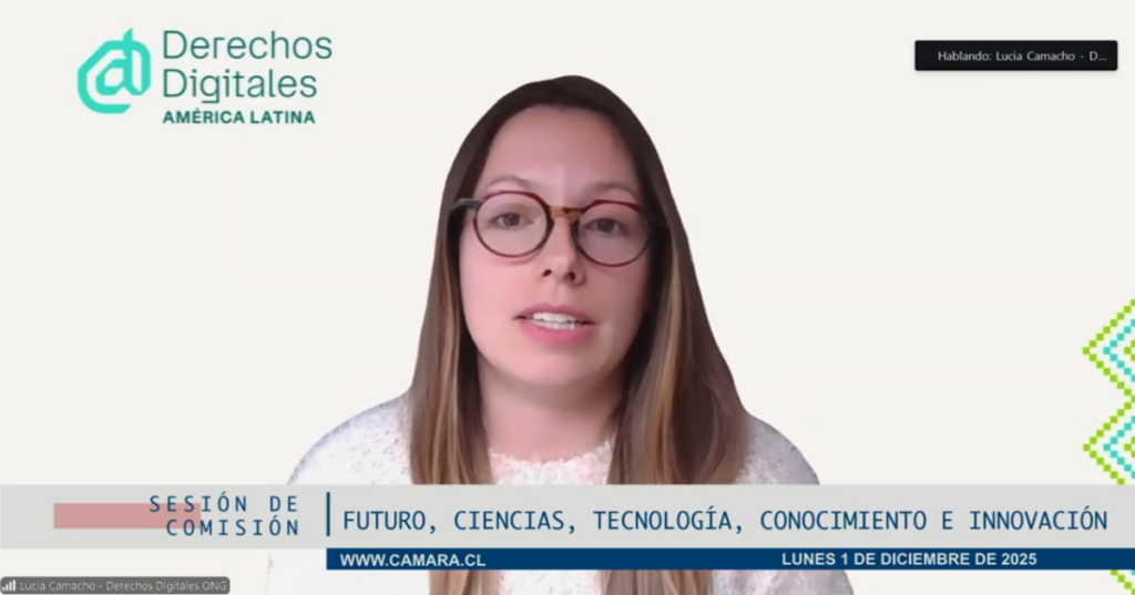 Lucía Camacho, coordinadora de Políticas Públicas de Derechos Digitales, realizó una exposición en referencia al Proyecto de Ley que “Regula la creación y difusión de imitaciones digitales realistas de la imagen, cuerpo o voz de las personas, generadas mediante inteligencia artificial”.