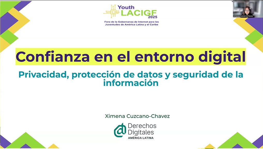 “Confianza en el entorno digital: privacidad, protección de datos y seguridad de la información” fue el nombre de la sesión donde Cuzcano realizó una presentación dirigida a juventudes latinoamericanas interesadas en el ámbito digital regional. Allí abordó, desde una perspectiva técnica pero también de Derechos Humanos, los distintos componentes de la confianza digital: privacidad, protección de datos, y seguridad de la información. En la instancia, se hizo hincapié en explicar cómo nuestras decisiones y prácticas institucionales inciden directamente en la seguridad de las personas en entornos digitales, con especial atención a los impactos diferenciados que enfrentan mujeres, activistas y comunidades vulnerables ante la falta de protección y rendición de cuentas.